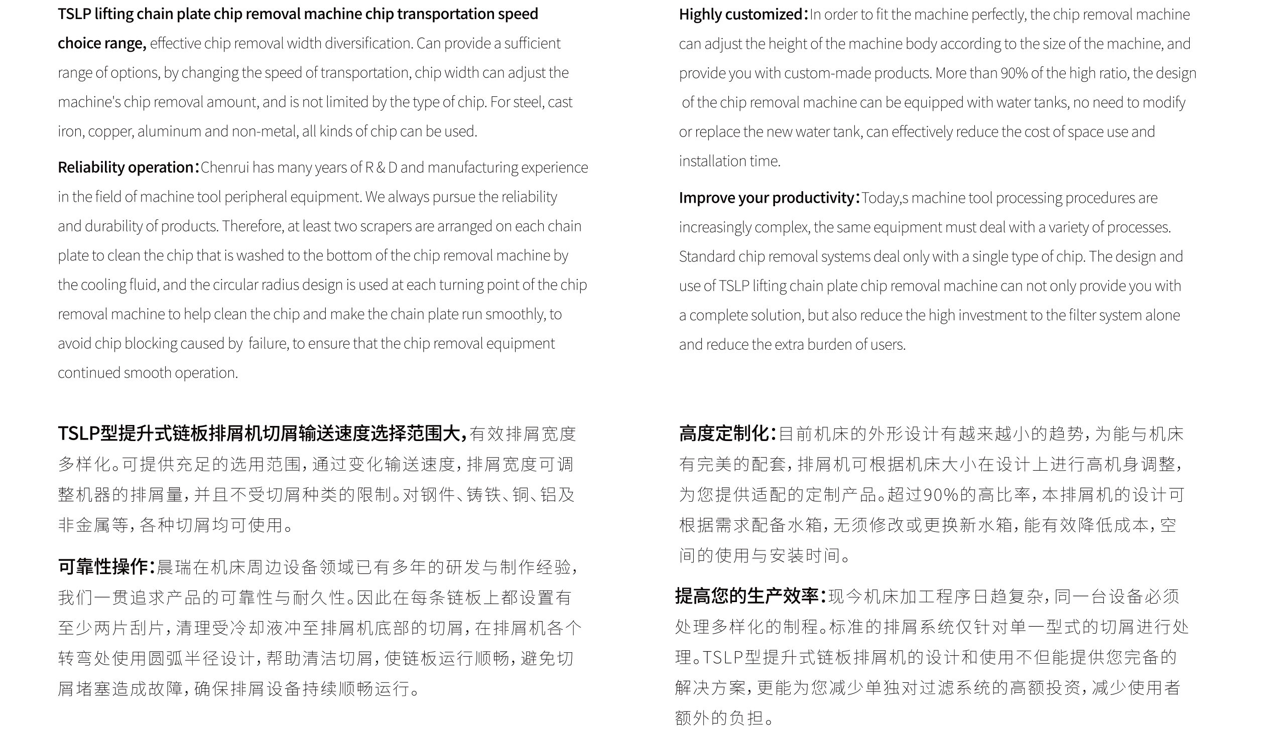 TSLP型提升式鏈板排屑機(jī)切屑輸送速度選擇范圍大,有效排屑寬度多樣化??商峁┏渥愕倪x用范圍,通過(guò)變化輸送速度,排屑寬度可調(diào)整機(jī)器的排屑量,并且不受切屑種類的限制。對(duì)鋼件、鑄鐵、銅、鋁及非金屬等,各種切屑均可使用。
