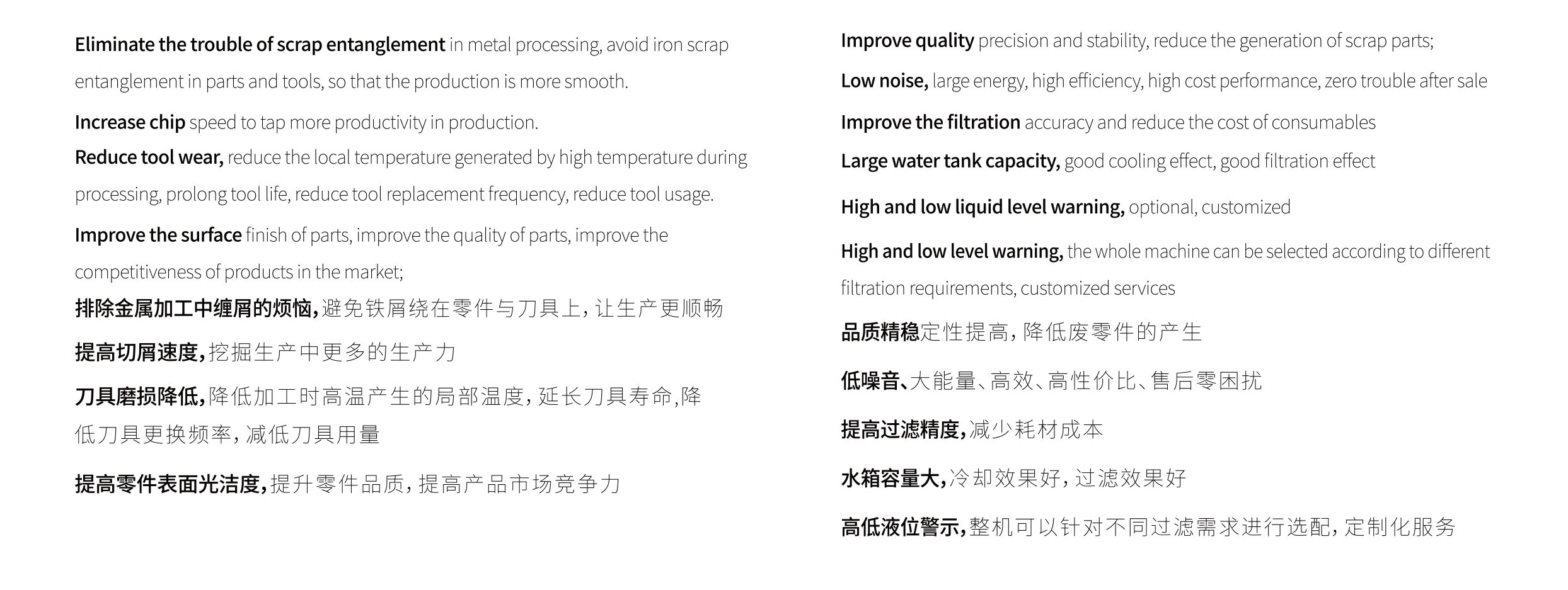 排除金屬加工中纏屑的煩惱,避免鐵屑繞在零件與刀具上,讓生產(chǎn)更順暢。提高切屑速度,挖掘生產(chǎn)中更多的生產(chǎn)力。刀具磨損降低,降低加工時(shí)高溫產(chǎn)生的局部溫度,延長刀具壽命,降低刀具更換頻率,減低刀具用量。提高零件表面光潔度,提升零件品質(zhì),提高產(chǎn)品市場(chǎng)競(jìng)爭(zhēng)力