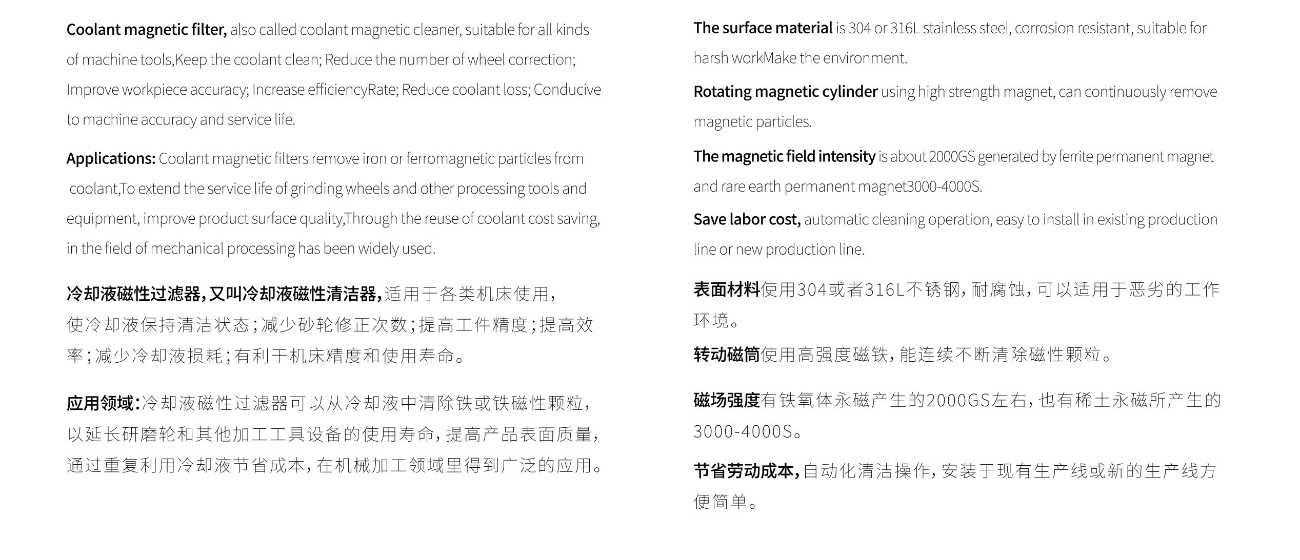 冷卻液磁性過(guò)濾器,又叫冷卻液磁性清潔器,適用干各類機(jī)床使用,使冷卻液保持清潔狀態(tài);減少砂輪修正次數(shù);提高工件精度;提高效率;減少冷卻液損耗;有利于機(jī)床精度和使用壽命。