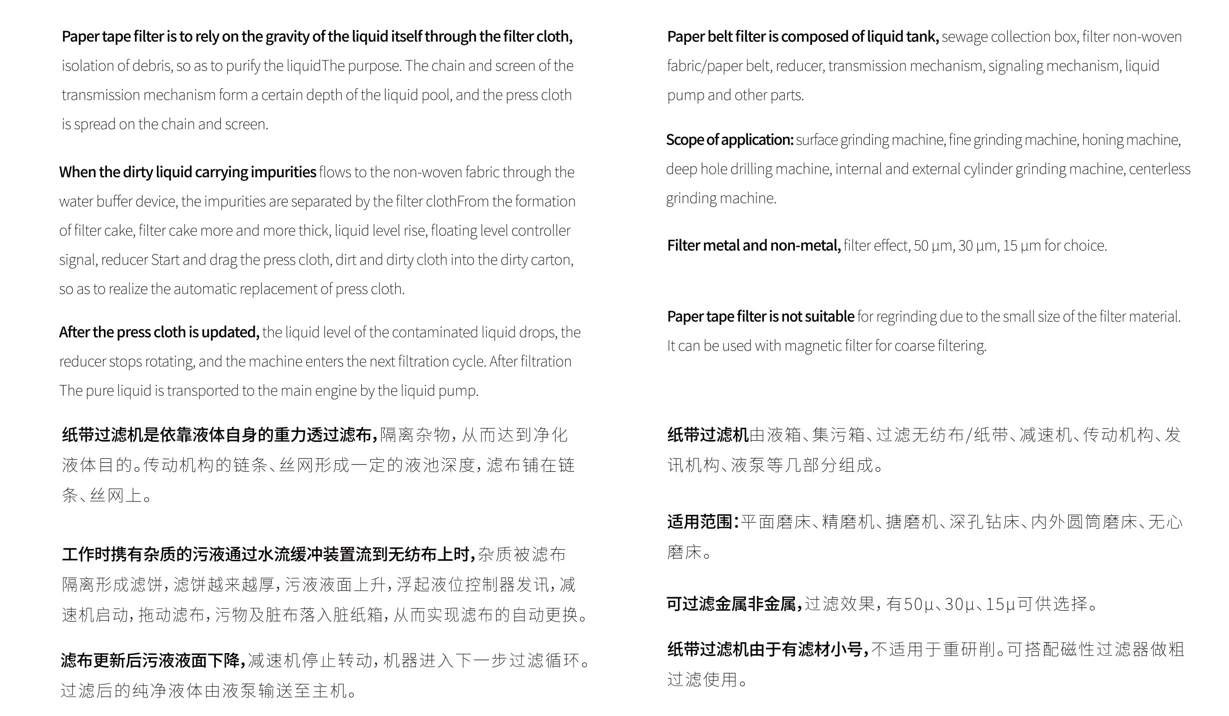 紙帶過濾機是依靠液體自身的重力透過濾布,隔離雜物,從而達到凈化液體目的。傳動機構(gòu)的鏈條、絲網(wǎng)形成一定的液池深度,濾布鋪在鏈條、絲網(wǎng)上。