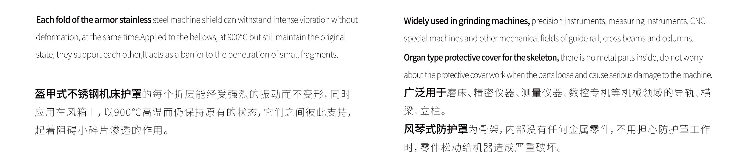 盔甲式不銹鋼機床護(hù)罩的每個折層能經(jīng)受強烈的振動而不變形,同時應(yīng)用在風(fēng)箱上,以900℃高溫而仍保持原有的狀態(tài),它們之間彼此支持,起著阻礙小碎片滲透的作用。
